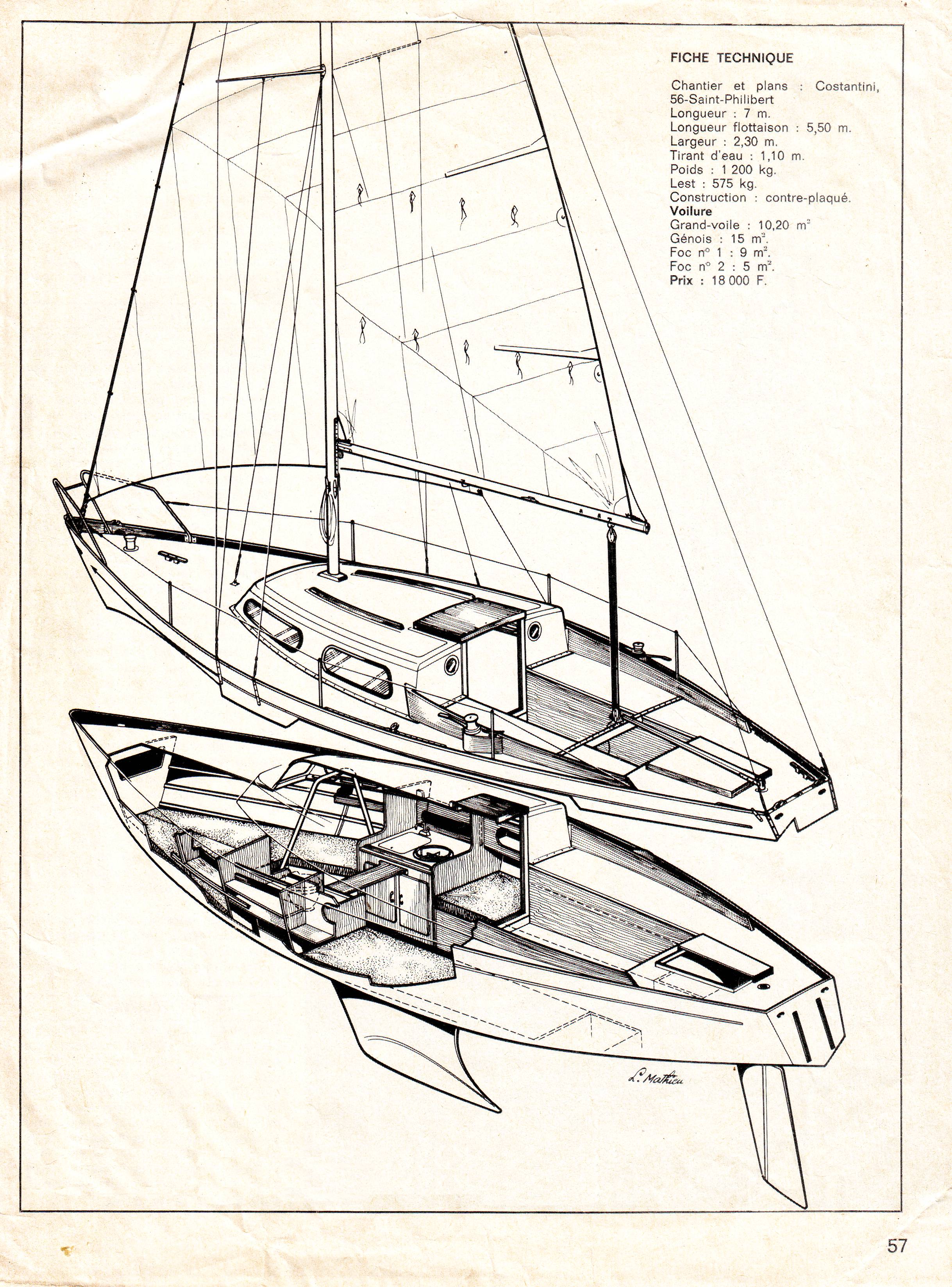 1ere version (1967): Coque en contreplaqué et roof en bois. 2ème version (1969): Coque et pont en Polyester avec sandwich en balsa